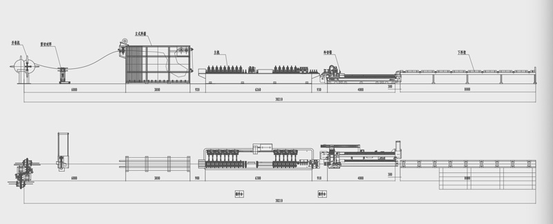 開(kāi)卷→立式儲(chǔ)料箱→校平→軋制成型→高頻焊接→刮刀→冷卻 →定徑→矯直→飛鋸切料→下料輥道 | ||||||||