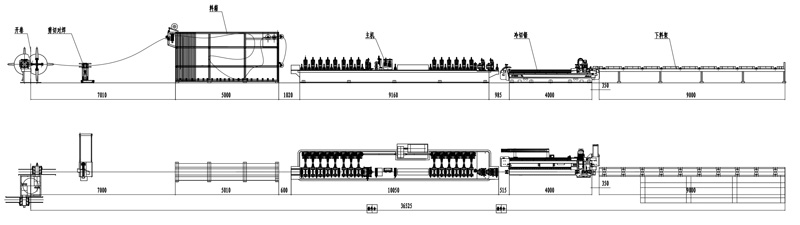 開卷→立式儲料箱→校平→軋制成型→高頻焊接→刮刀→冷卻 →定徑→矯直→飛鋸切料→下料輥道 | ||||||||