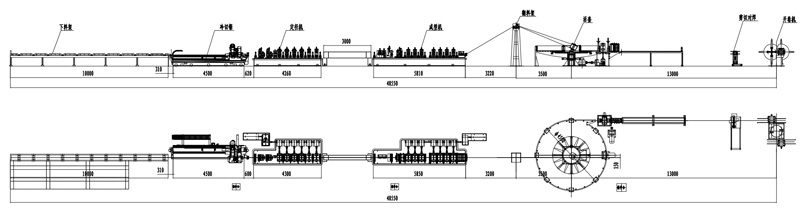 開卷→剪切對焊→臥式螺旋活套→校平→軋制成型→高頻焊接→刮刀→冷卻 →定徑→矯直→ 飛鋸切料→下料輥道 |