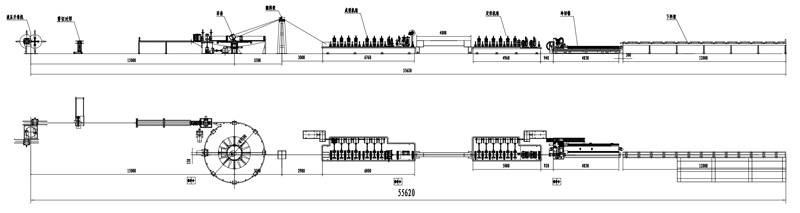 開(kāi)卷→剪切對(duì)焊→臥式螺旋活套→校平→軋制成型→高頻焊接→刮刀→冷卻 →定徑→矯直 →飛鋸切料→下料輥道 |
