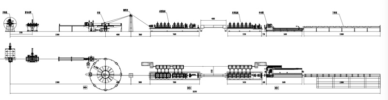 開卷→剪切對焊→臥式螺旋活套→校平→軋制成型→高頻焊接→刮刀→冷卻 →定徑→矯直 →飛鋸切料→下料輥道 |