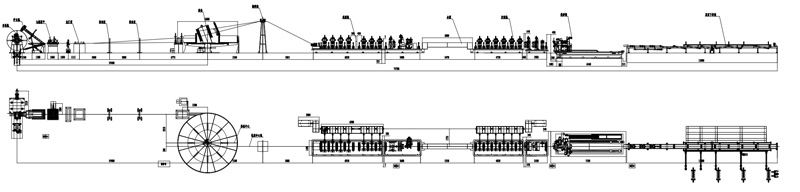 上料小車(chē)→開(kāi)卷→剪切對(duì)焊→臥式螺旋活套→校平→軋制成型→高頻焊接→刮刀→冷卻 →定徑 →矯直→飛鋸切料→下料輥道 |