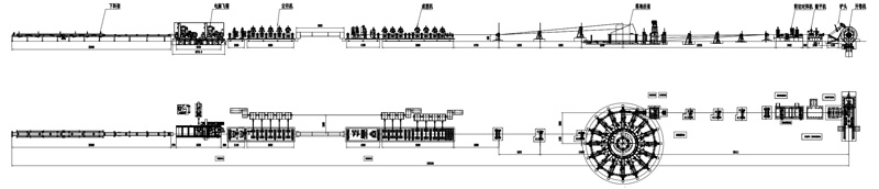 上料小車→開卷→剪切對焊→臥式螺旋活套→校平→軋制成型→高頻焊接→刮刀→冷卻 →定徑→矯直 →飛鋸切料→下料輥道 |